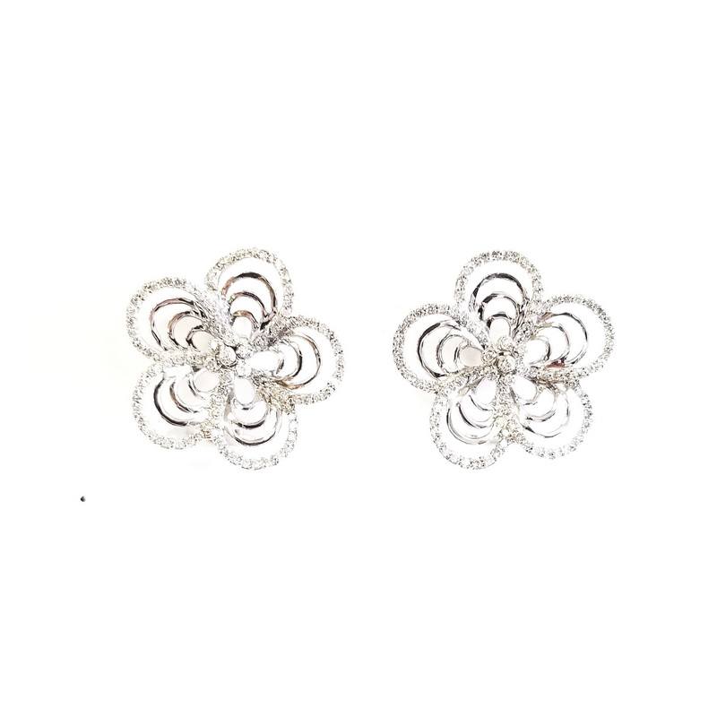 Does Beetlejuice vibe anyone? The 18K White Gold Ripple Flower Earrings with Diamonds are unique and funky designed earrings. Composed of 18k white gold, the earrings are shaped into flowers with multiple smaller layers of flowers. The largest flower layer is paved with diamonds for added luster as well as a central diamond in the middle. Wear this adornment for special occasions or for daily wear with all sorts of colors and see the difference these earrings can make!